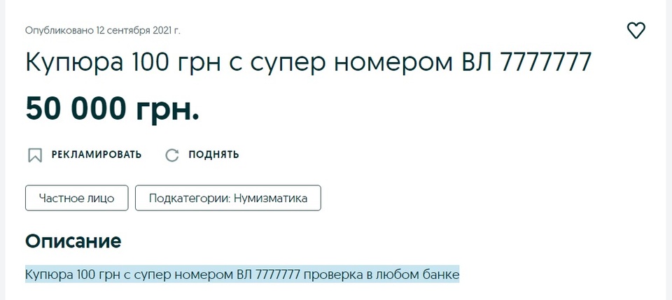 «Купюра 100 грн із супер номером ВЛ 7777777. Перевірка в будь-якому банку», - вказано у оголошенні.