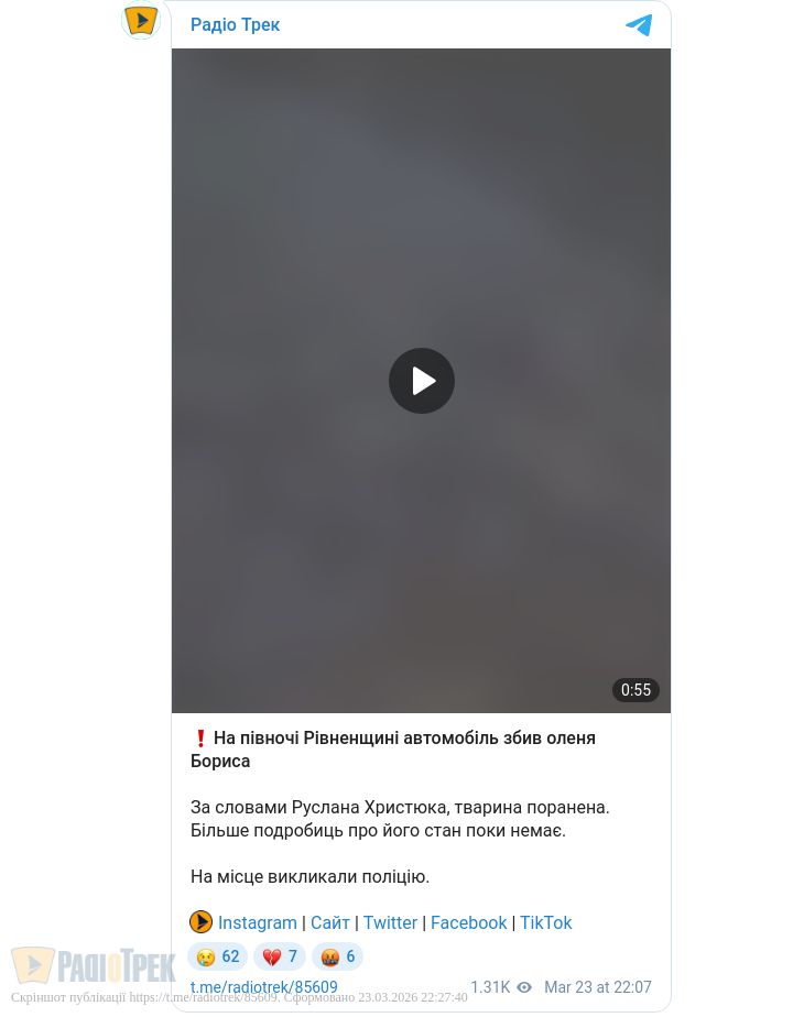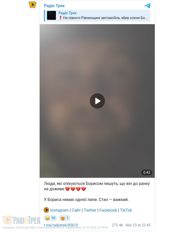 Перлину Рівненщини, оленя Бориса, збив автомобіль (ВІДЕО 18+)