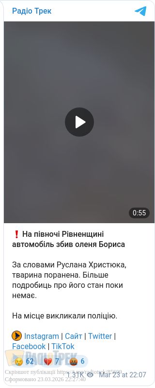 На півночі Рівненщині автомобіль збив оленя Бориса. За словами Руслана Христюка, тварина поранена.