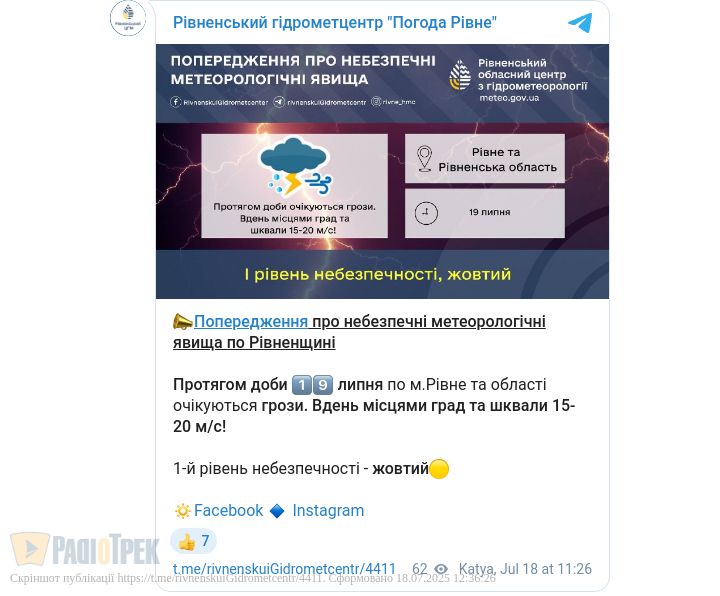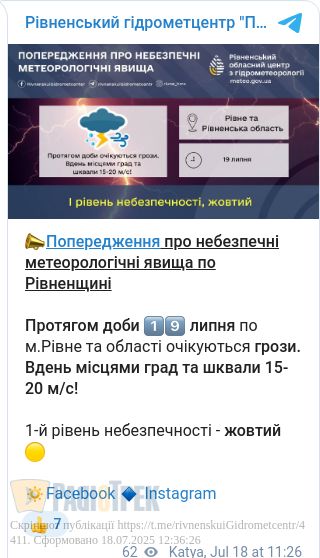 Завтра, 19 липня, у Рівному та області очікується негода.