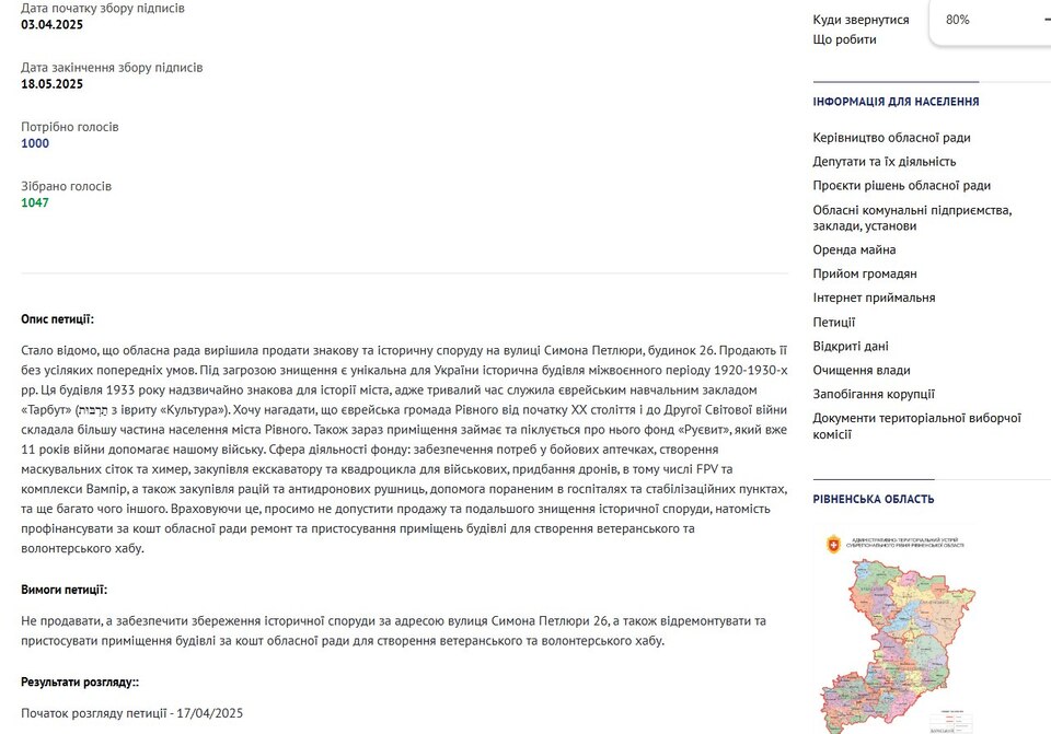 Мешканці Рівненщини проти продажу приміщення на Симона Петлюри 26. Вперше за два роки на сайті обласної ради опублікували нову петицію.