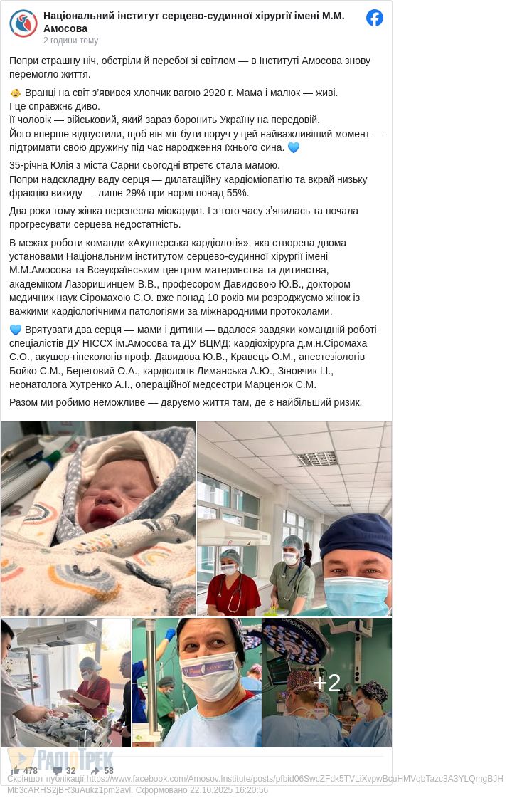 Під час обстрілу Києва в Інституті Амосова народився хлопчик вагою 2920 грамів. Мама і дитина почуваються добре.