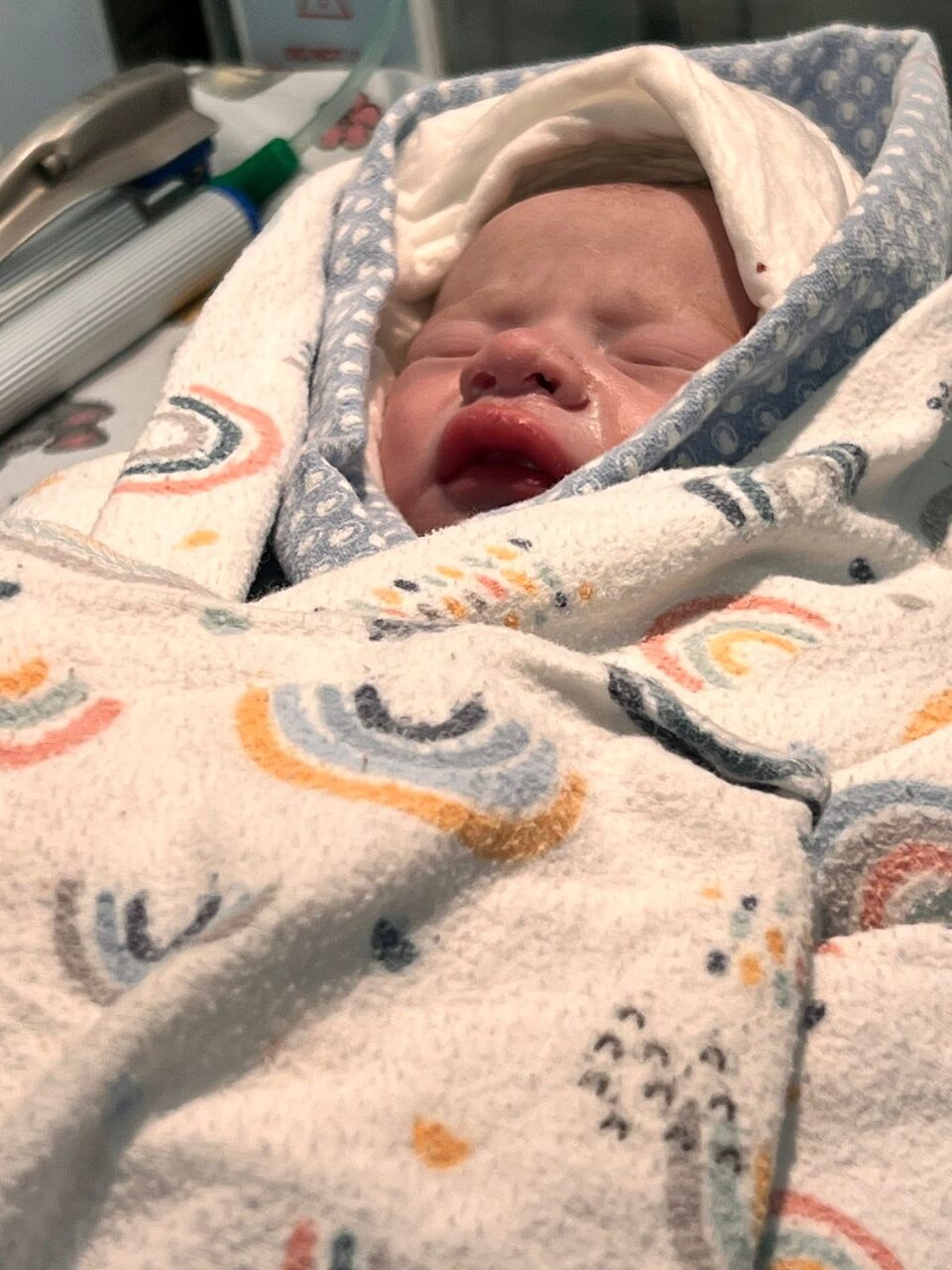 Це третя дитина 35-річної Юлії із Сарн. Її чоловік, який зараз служить на передовій, отримав дозвіл бути поруч із дружиною під час пологів.