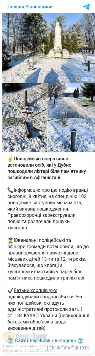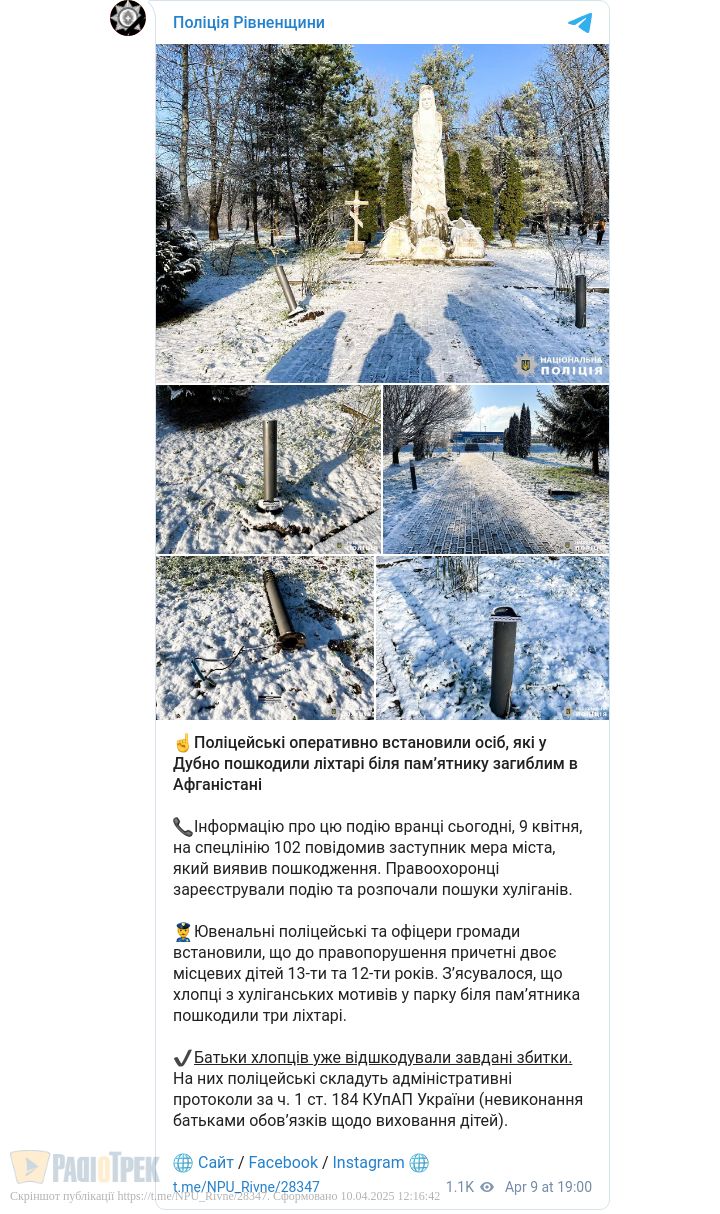 Двоє підлітків у Дубні пошкодили ліхтарі біля пам'ятника загиблим в Афганістані . Інцидент стався нещодавно, там місцеві хлопці 12-ти та 13-ти років зламали три світильники.