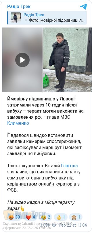 Нагадаємо, в ніч на 22 лютого у Львові пролунали два вибухи. Унаслідок атаки загинула 23-річна поліцейська.