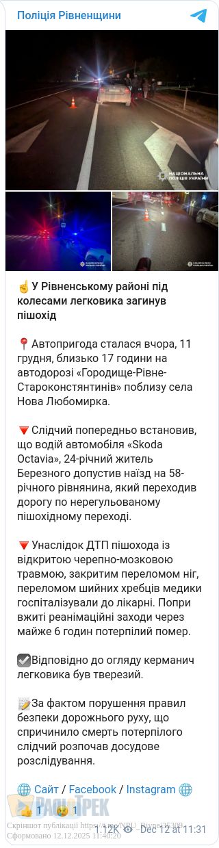 Пішохода з тяжкими травмами госпіталізували, однак через майже шість годин він помер у лікарні. Водій був тверезий.