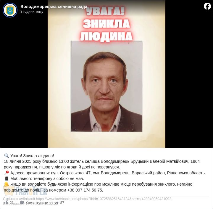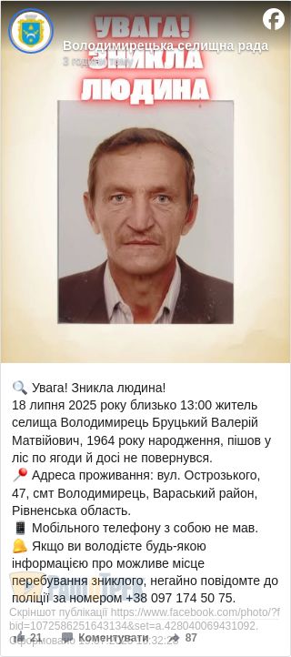Напередодні близько 13 години чоловік пішов у ліс по ягоди й досі не повернувся. Відомо, що мобільного телефону чоловік при собі не мав, повідомили у Володимирецькій селищній раді.