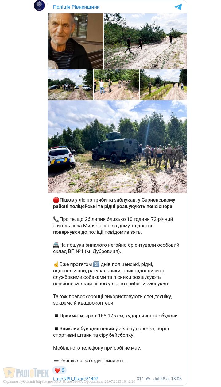 Протягом 3 днів на Сарненщині поліцейські, рідні, односельчани, рятувальники, прикордонники зі службовими собаками та лісники розшукують 72-річного пенсіонера, який пішов у ліс по гриби та заблукав.