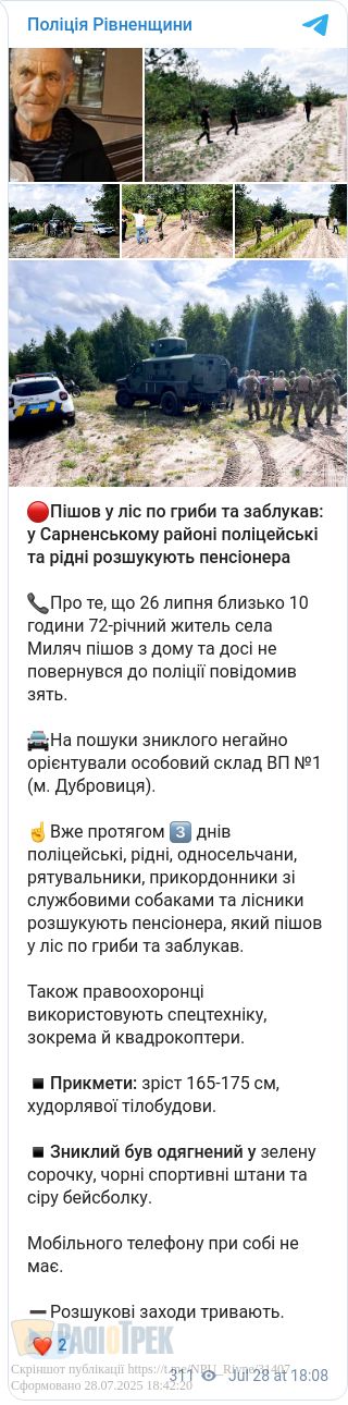 Пішов у ліс по гриби та заблукав: на Сарненщині розшукують пенсіонера (ФОТО)