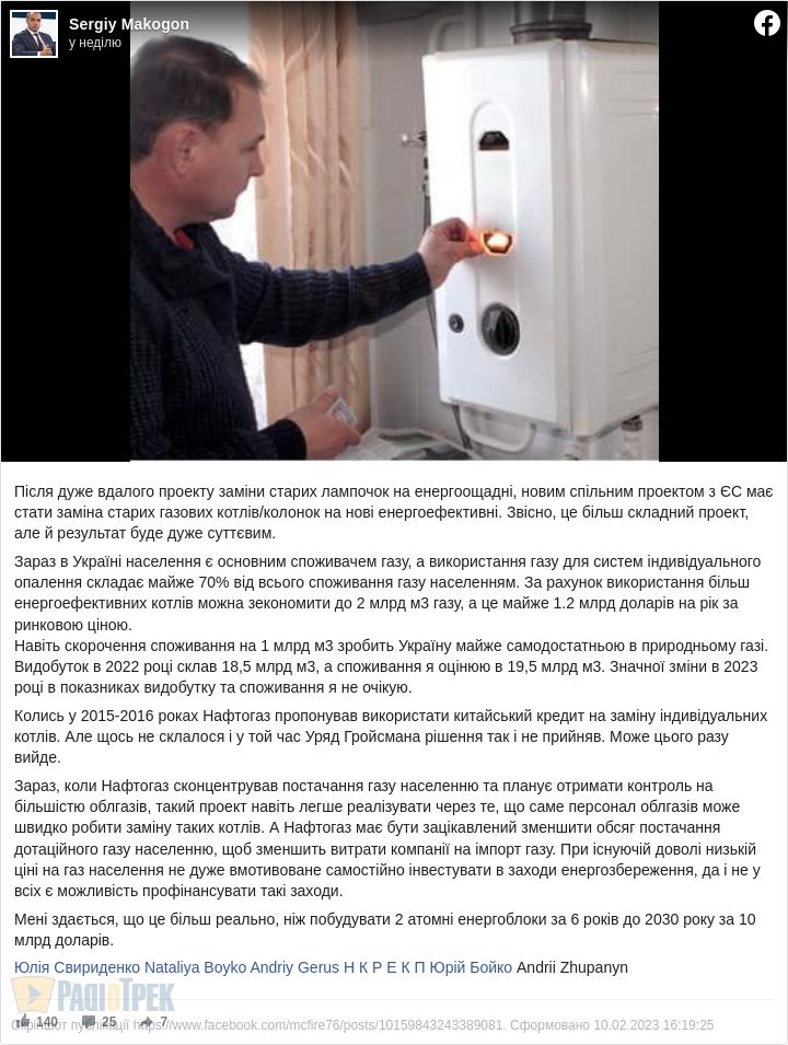 Сергій Макогон каже, що заміну старих газових котлів легше і швидше реалізувати, ніж звести два атомних енергоблоки за шість років за 10 млрд доларів.