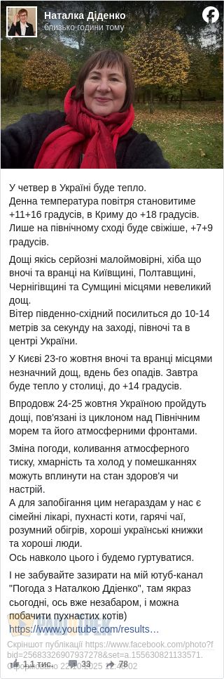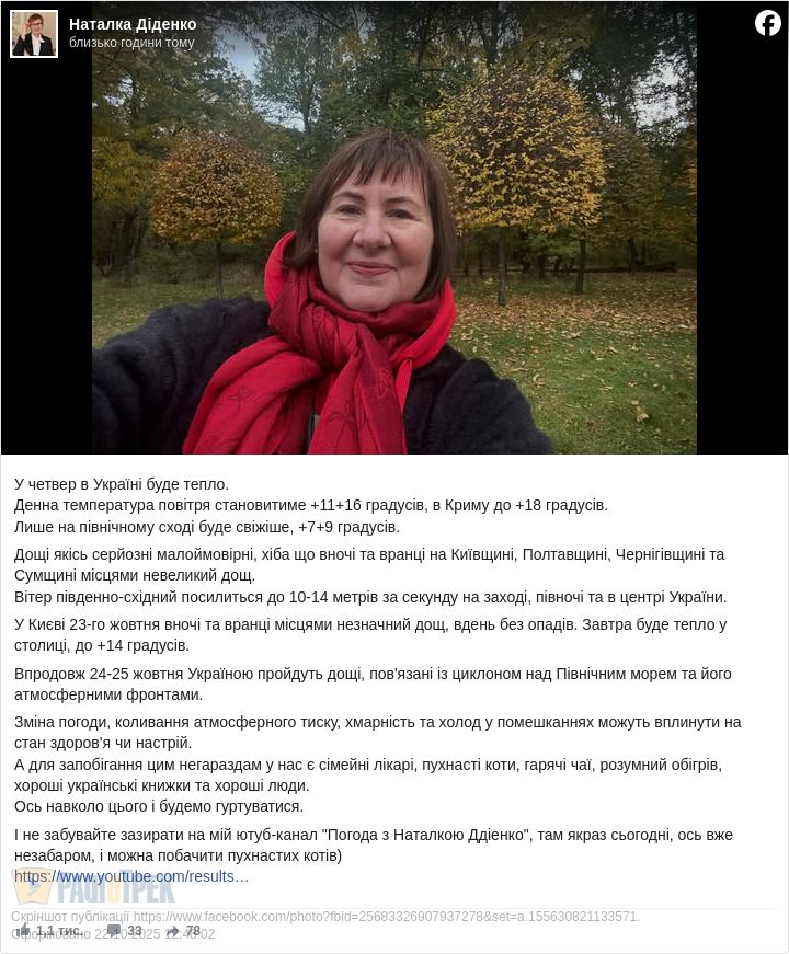 Завтра, 23 жовтня, в Україні буде тепла погода. Очікується до +11...+16 градусів. Свіжіше буде лише на північному сході. Там очікується до +7...+9 градусів, повідомила синоптик Наталка Діденко.