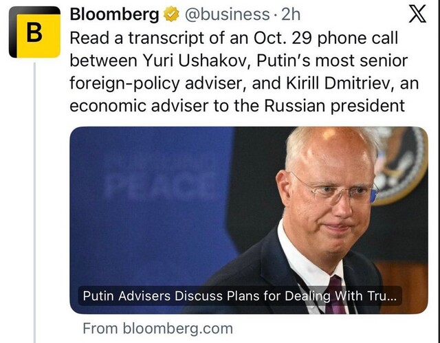 Агенство Bloomberg опублікувало транскрипт розмови Юрія Ушакова (який керує «зовнішнім напрямком» при Путіні) та Стіва Віткоффа – спецпредставника Президента США.