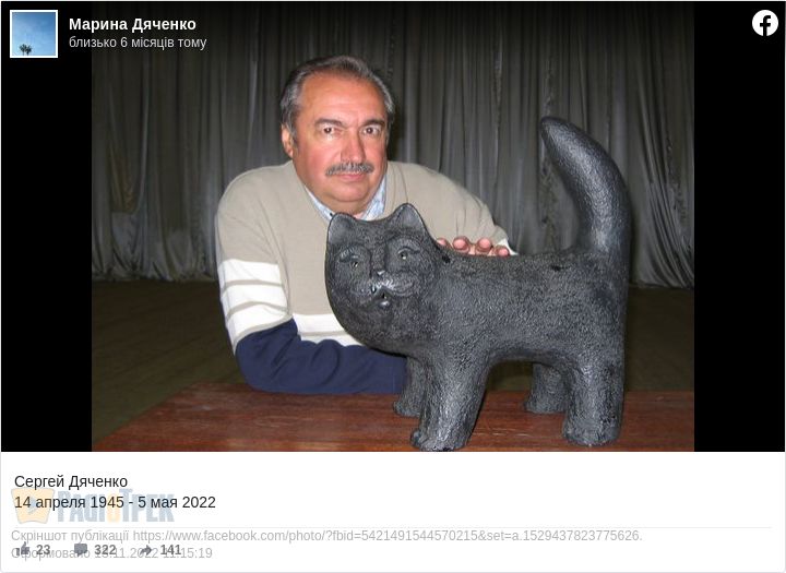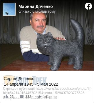 Причина смерті – невідома. У дописі Марина Дяченко вказала тільки ім'я й дати народження та смерті: 14 квітня 1945 — 5 травня 2022.