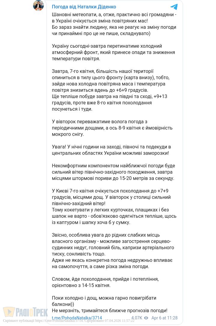 Холодний атмосферний фронт приніс у більшість областей опади та зниження температури повітря. Завтра, 8 квітня, похолодання пошириться й на Південь і Схід, повідомила синоптик Наталка Діденко.
