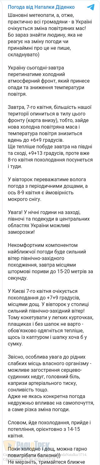 Також вона зауважила, що 8-9 квітня в Україні буде ймовірність мокрого снігу. Холодна погода триватиме орієнтовно до 14-15 квітня.