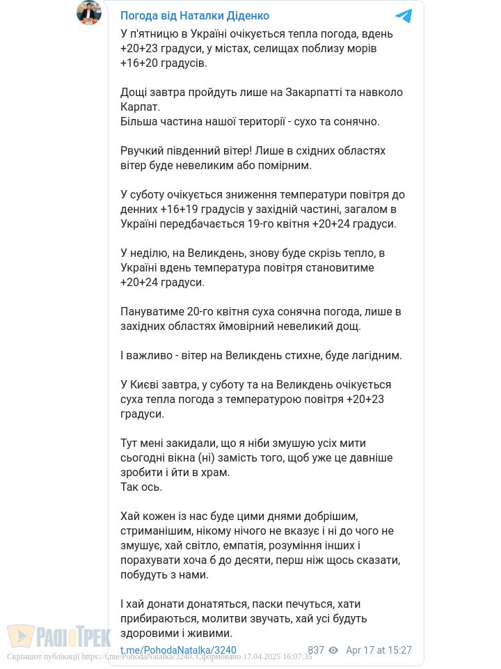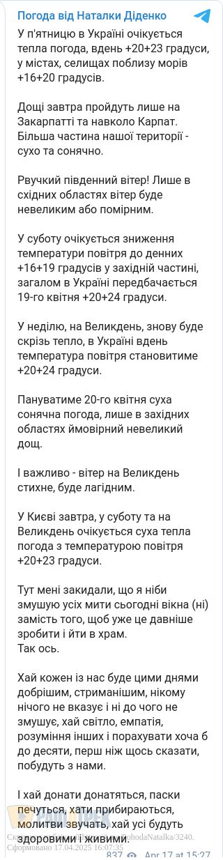 У неділю 20 числа тепло повернеться. Повсюди очікується до +20...+24 градусів. На Великдень буде не лише тепла, а й сонячна погода. Лише в західних областях ймовірний невеликий дощ.
