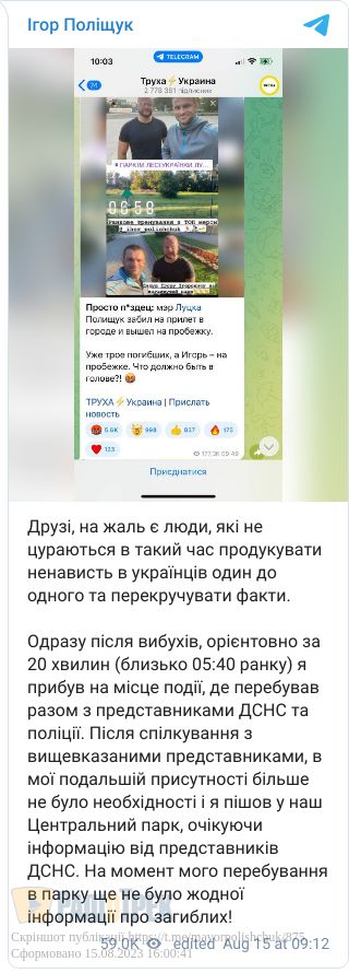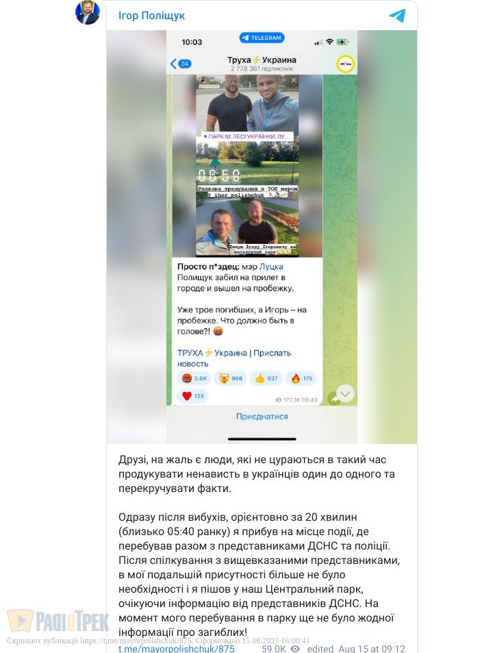 Так, в українських Telegram-каналах, серед яких є й дуже популярні, з’явилася інформація про те, що мер Луцька Ігор Поліщук нібито займався тренуваннями у парку в той час, коли від ракетних ударів рф у його місті гинули люди. Інформація, до речі, базувалася на фотографіях самого Поліщука у соцмережах.