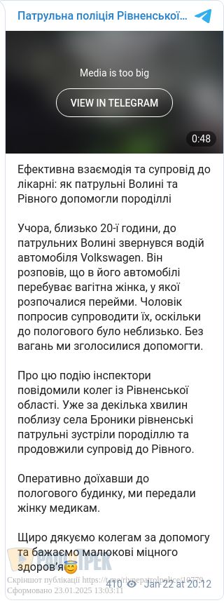 Патрульні двох областей супроводжували вагітну до Рівненського обласного перинатального центру. У вівторок ввечері до патрульних Волині звернувся водій автомобіля Volkswagen і повідомив, що везе жінку, у якої почалися перейми.