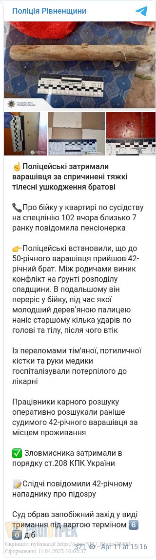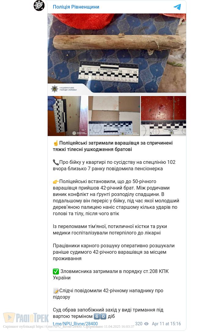Поліцейські затримали жителя Вараша, який жорстоко побив брата через спадщину
