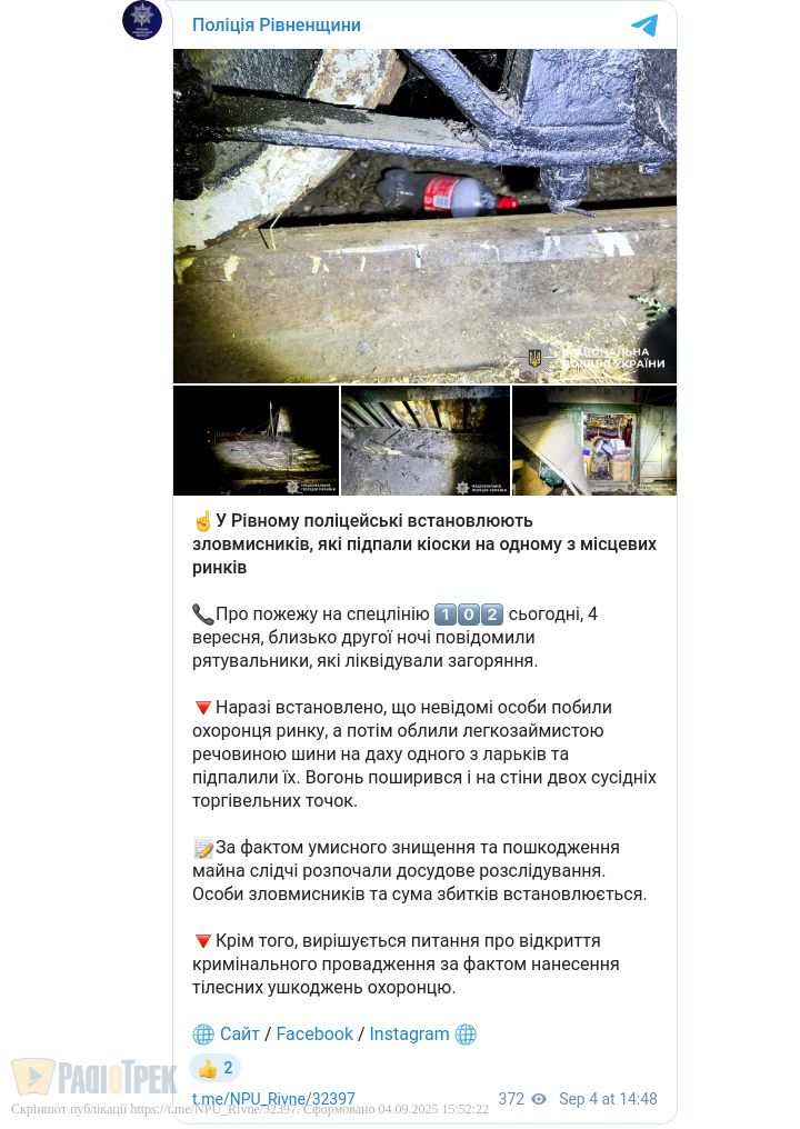 Потім легкозаймистою речовиною облили шини на даху одного з ларьків та підпалили їх. Вогонь поширився на сусідні торгові точки. Слідчі розпочали досудове розслідування.