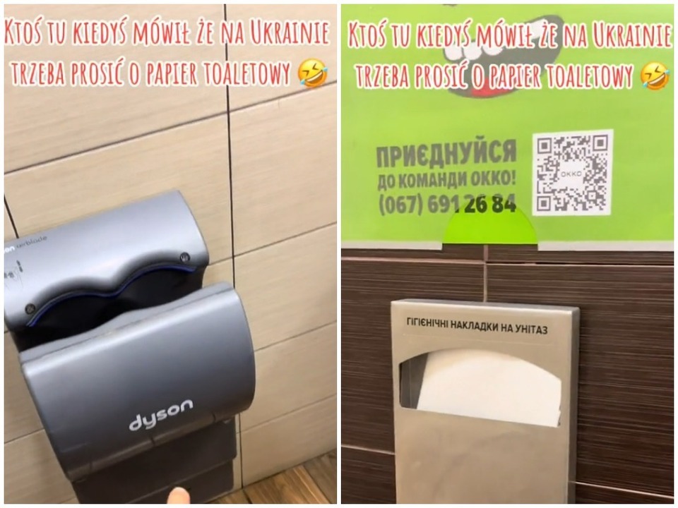 Чоловік під час «екскурсу» звернув увагу на сушилку для рук фірми Dyson, так само, як в Польщі, а також на наявність туалетного паперу.