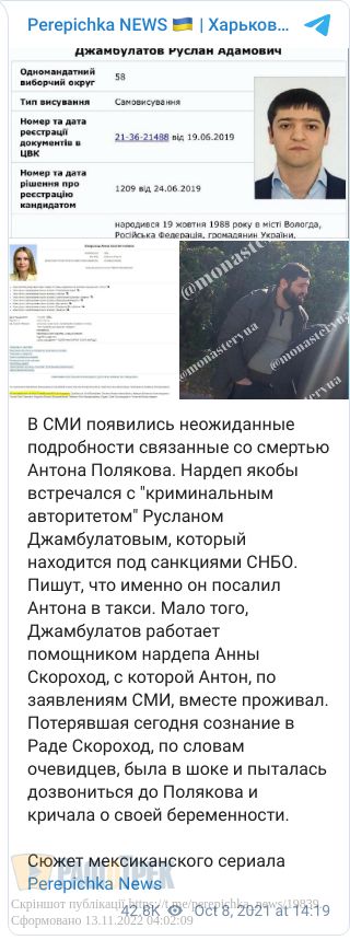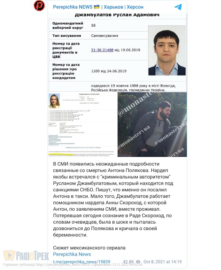- У депутатки Анни Скороход є помічник Руслан Джамбулатов. Відомо, що Поляков жив разом із колегою із депгрупи «За майбутнє» Анною Скороход, яку, як і його, виключили з фракції «Слуга народу».