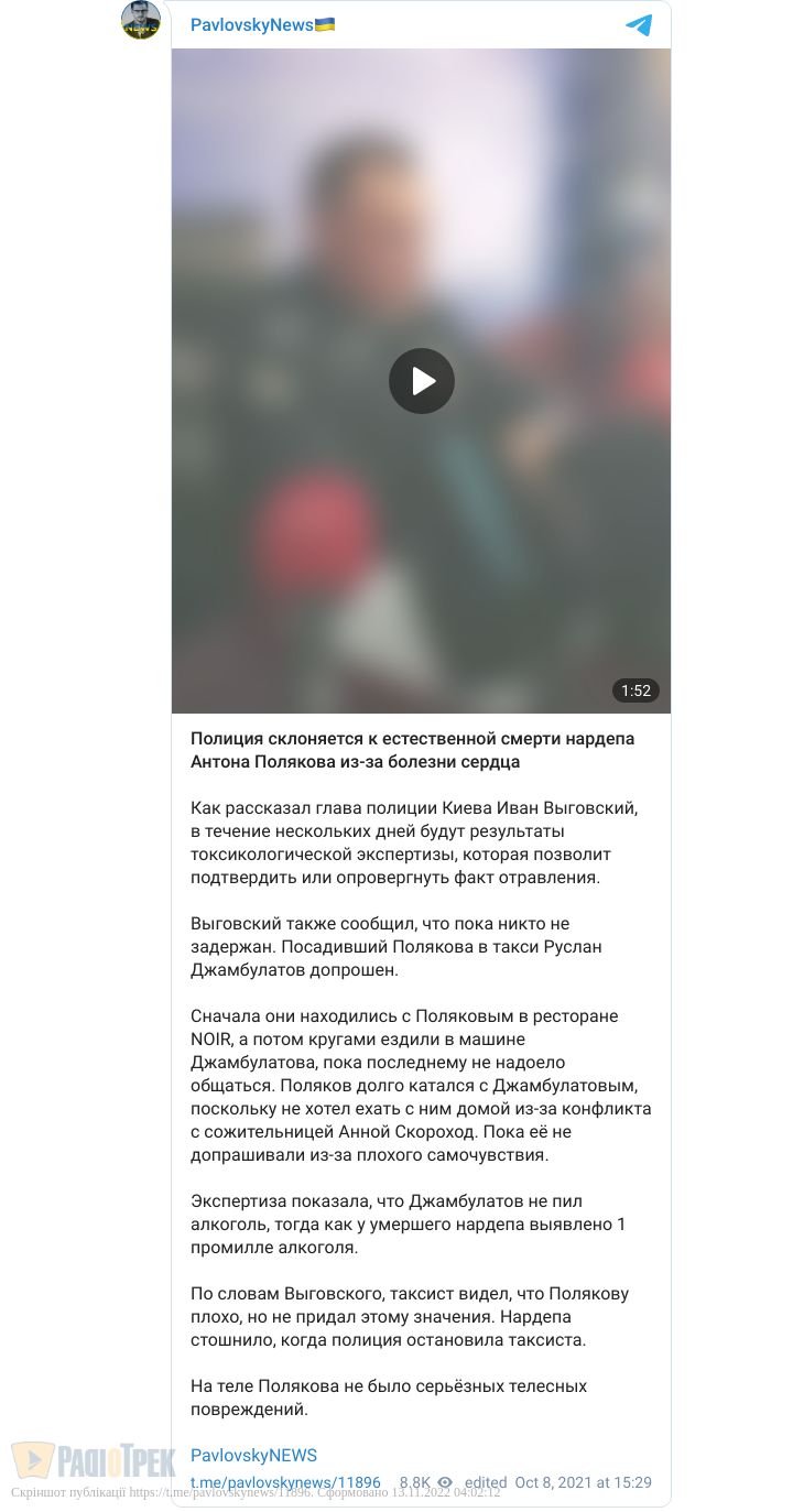 - 8 жовтня вранці, після звістки про смерть Полякова, Скороход знепритомніла у Верховній Раді.