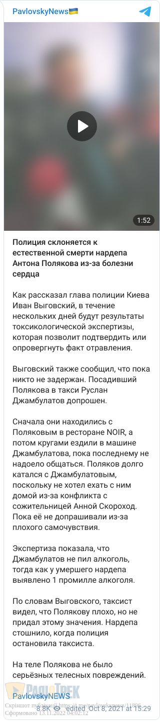 Перед смертю Поляков увечері відпочивав разом із людиною на ім’я Руслан Джамбулатов у київському ресторані «Нуар».