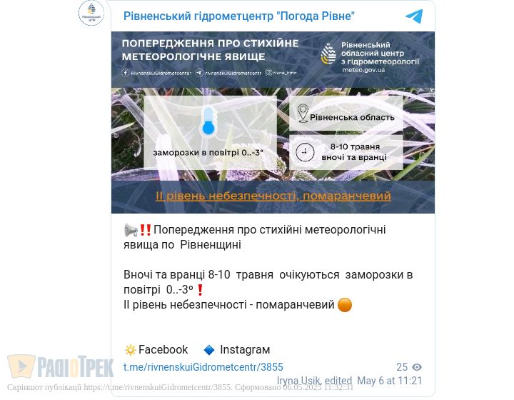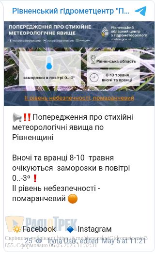 А у період з 8 по 10 травня в області очікуються заморозки до -3 градусів.