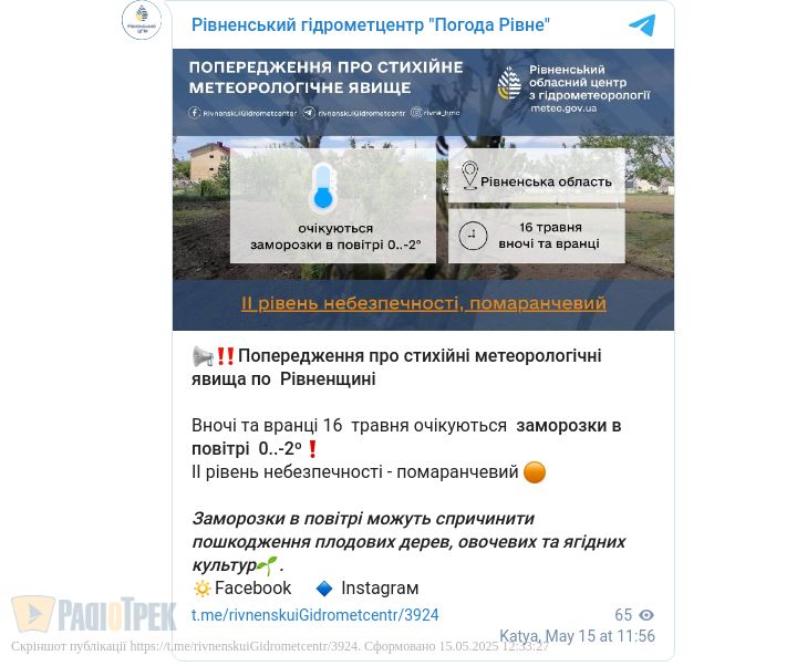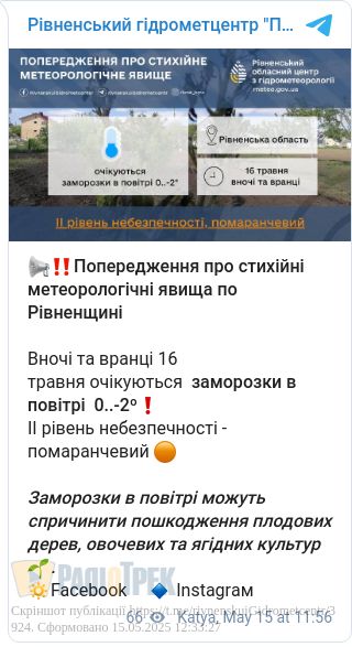 В повітрі буде від нуля до -2 градусів. Це ІІ рівень небезпеки, «помаранчевий», повідомили у Рівненському гідрометцентрі.