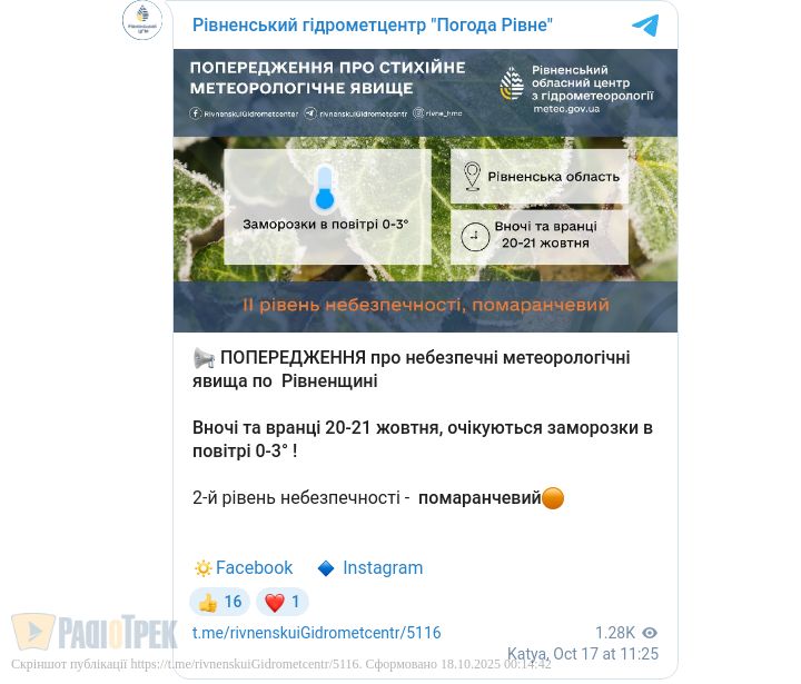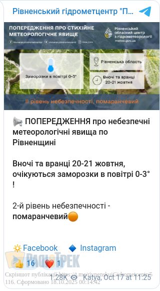 Вночі та вранці 20 та 21 жовтня в повітрі очікується до 0...-3 градусів.