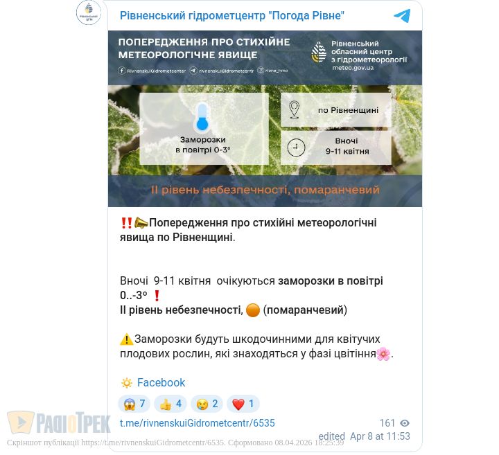 Уночі з 9 по 11 квітня у Рівному та області очікуються заморозки. В повітрі буде від нуля до -3 градусів.
