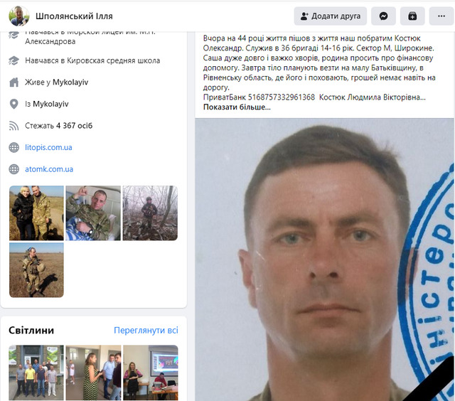 Олександр Костюк служив у 36-ій бригаді, сектор М, місто Широкине.