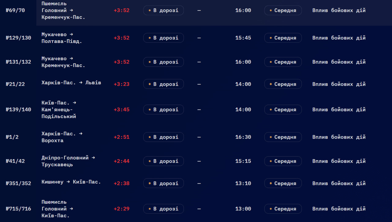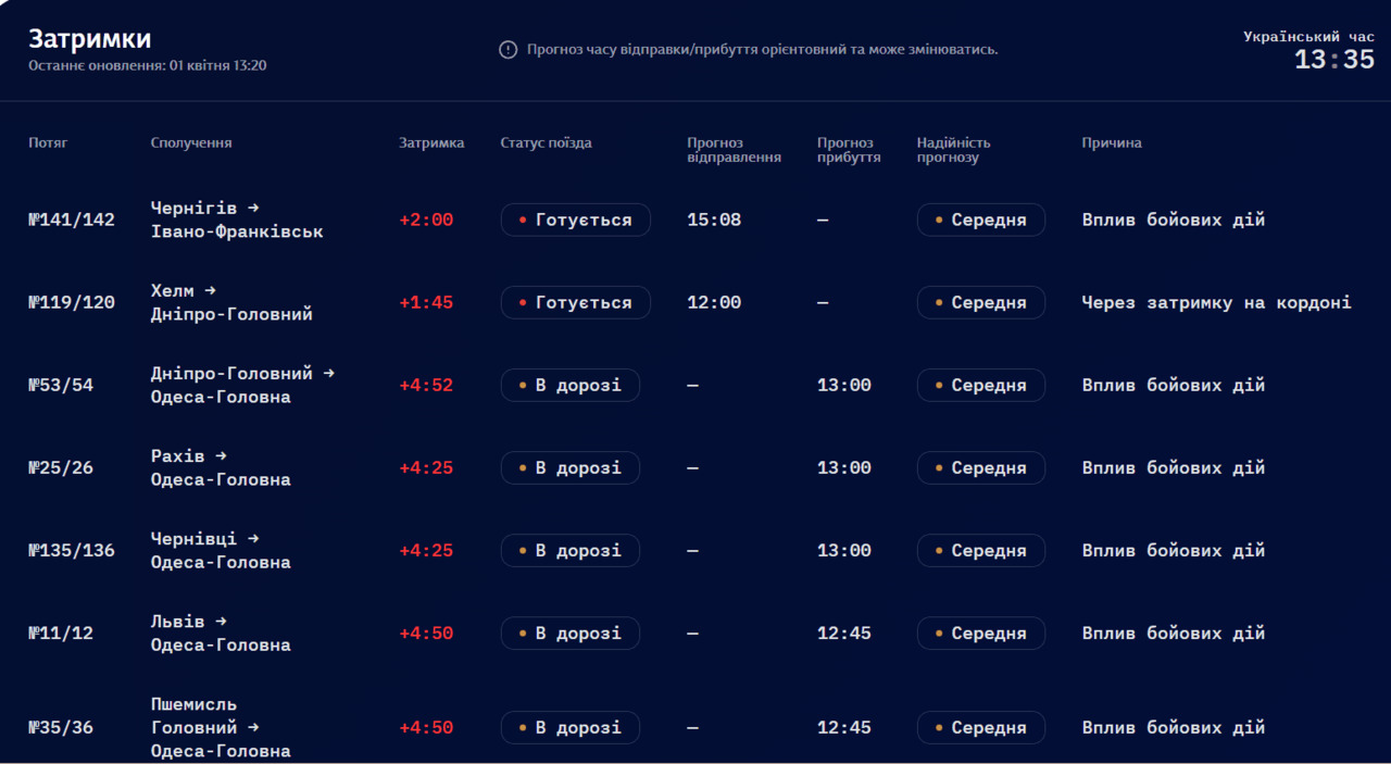 Через атаки російських дронів по всій Україні 1 квітня потяги масово затримуються. Деякі взагалі ще не вирушили з вокзалів.