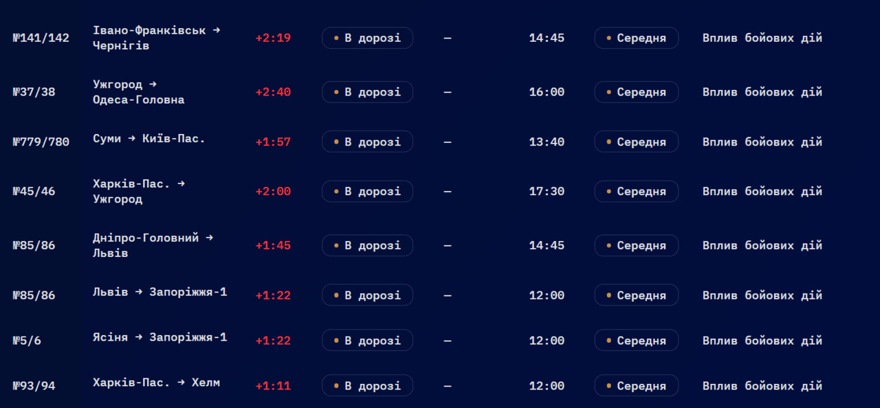 Зокрема, потяг №119/120 Хелм — Дніпро-Головний затримується на майже 3 години, а рейси №23/24 Київ — Хелм і №67/68 Київ — Варшава Заходня затримуються на 4 години.