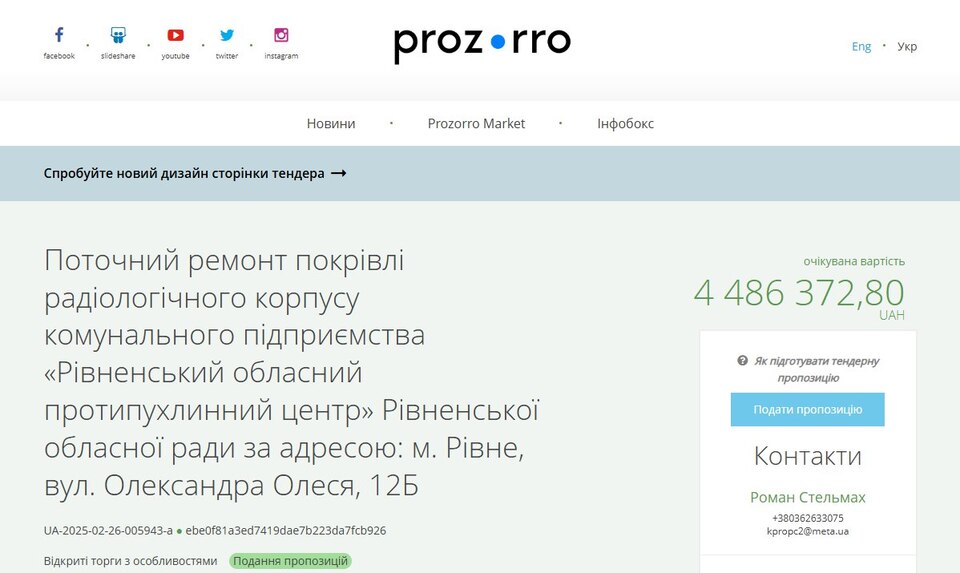 За ці кошти у медзакладі відремонтують покрівлі радіологічного корпусу. Про це йдеться на сайті Прозорро.