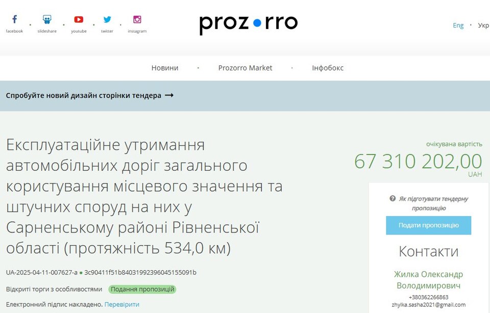 Понад 67 мільйонів гривень витратять на ремонт доріг у Сарненського району. Такий тендер днями оголосили на сайті Прозорро.