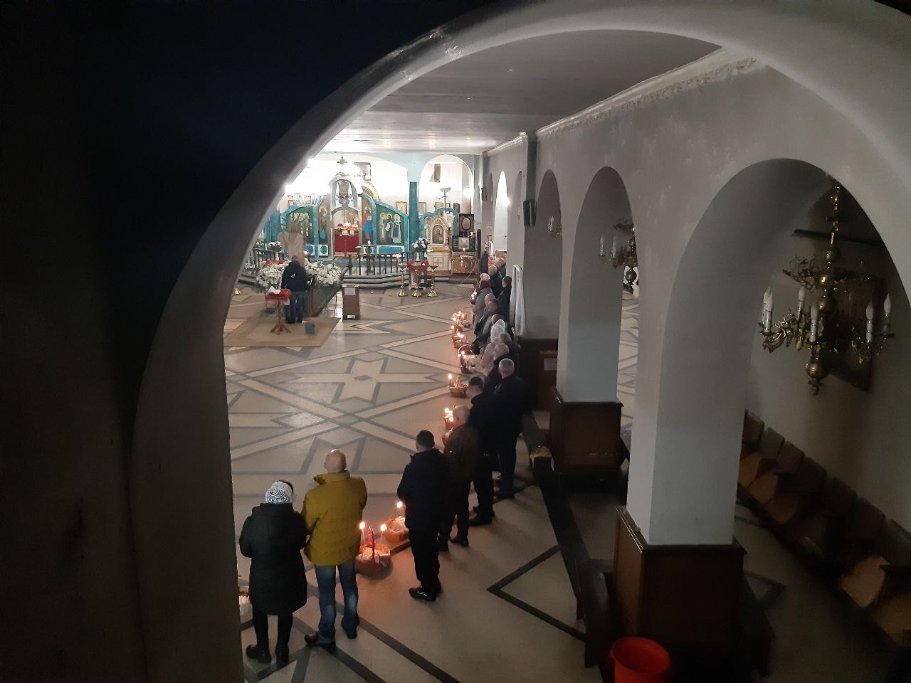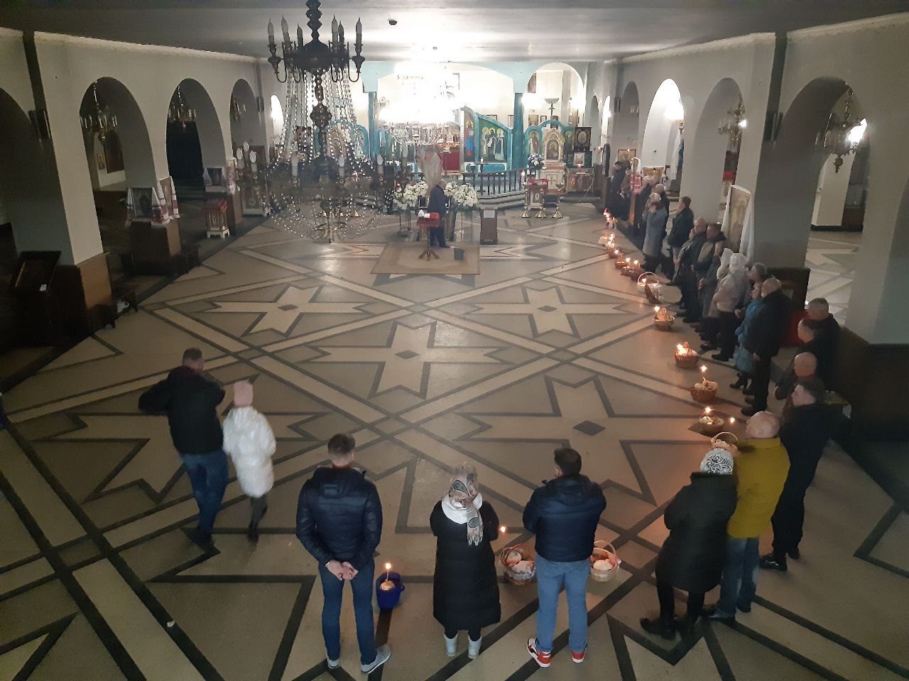 Вони всі розмістилися у нижньому храмі, де після короткої літії під класичний розспів «Христос воскрес із мертвих» людям посвятили їхні пасочки та освятили і їх самих святою водою.