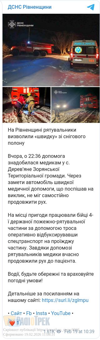 Рятувальники визволили «швидку» зі снігового замету на Рівненщині. Напередодні у селі Дерев’яне через негоду карета екстреної допомоги не змогла проїхати на виклик.
