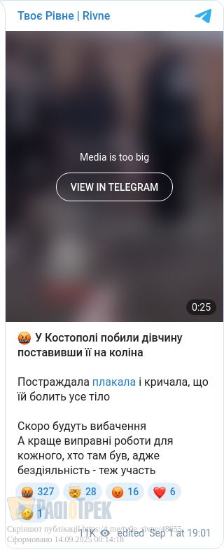 На Рівненщині школярі зняли на відео, як група підлітків знущається з восьмикласниці. Подія сталася на даху недобудови. На кадрах видно, як дівчина стоїть навколішки, а інша її б’є, довкола чути сміх та крики, йдеться у сюжеті ТСН