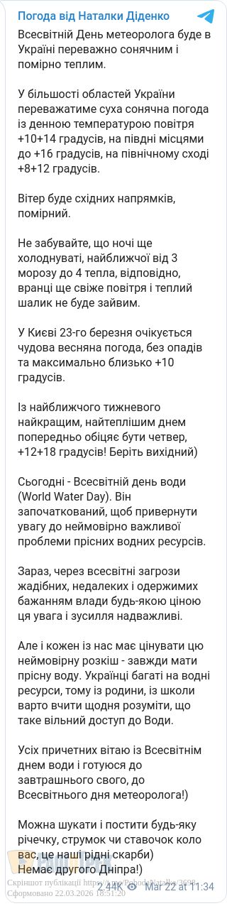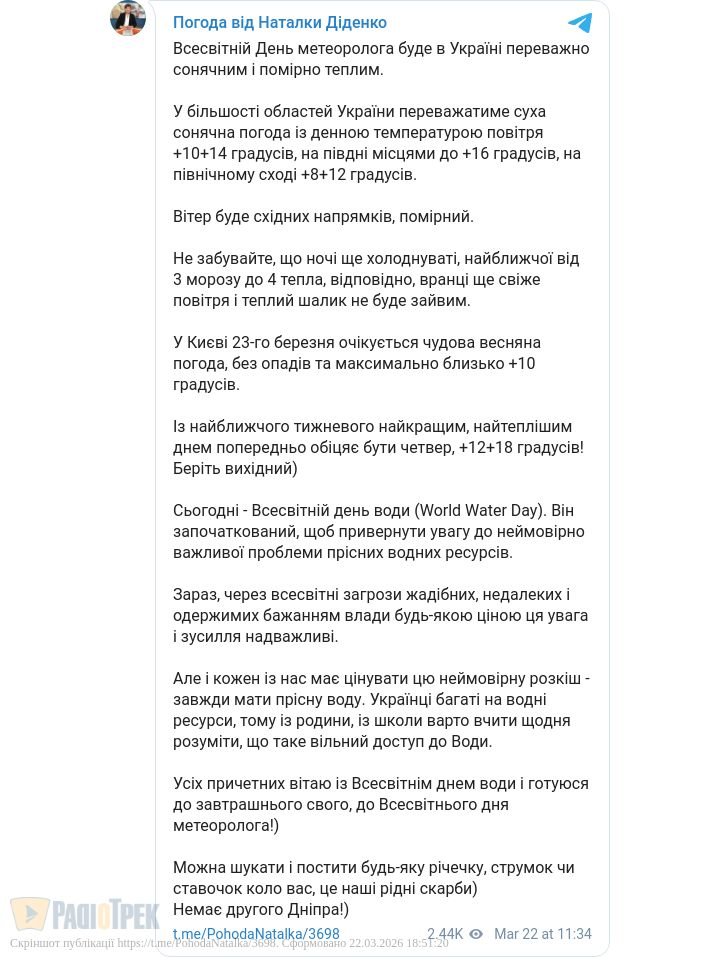 Завтра, 23 березня, у більшості областей України переважатиме суха сонячна погода із денною температурою повітря +10...+14 градусів. На Півдні місцями буде до +16 градусів, повідомила синоптик Наталка Діденко.