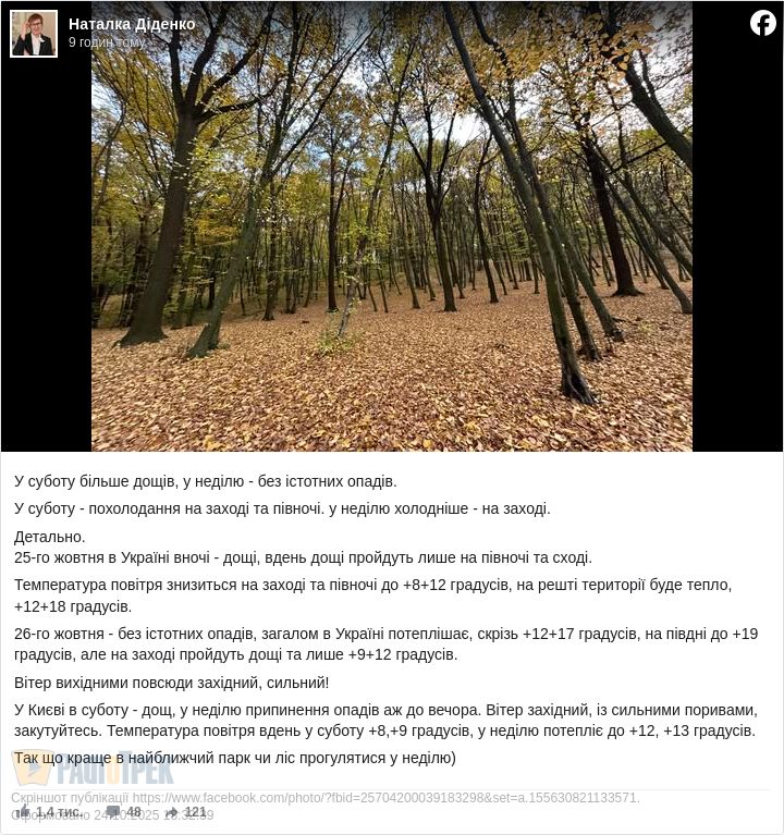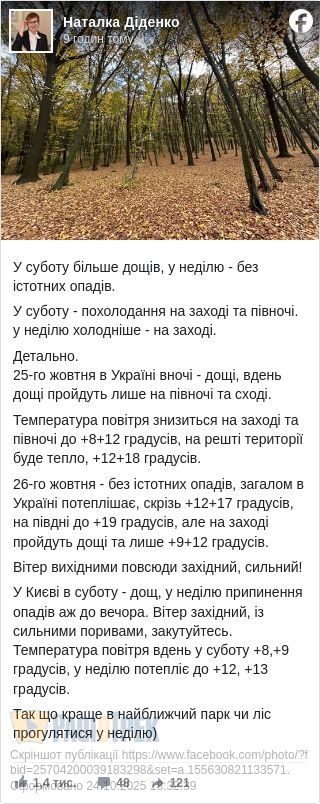 У неділю 26 жовтня по всій країні буде без істотних опадів та потеплішає до +12...+17 градусів. На Півдні повітря прогріється аж до +19 градусів. Прохолодніше буде лише на Заході, де очікується до +9...+12 градусів.