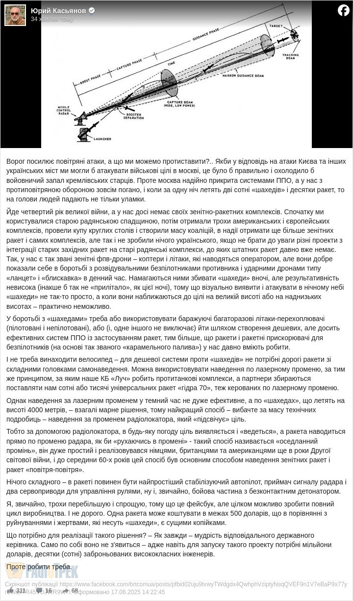Юрій Касьянов один із піонерів теми БПЛА в Україні. Типово цей чоловік слів на вітер не кидає, то ж до його думок на тему протидії російським «шахідам», очевидно, ваото дослухатися всім.