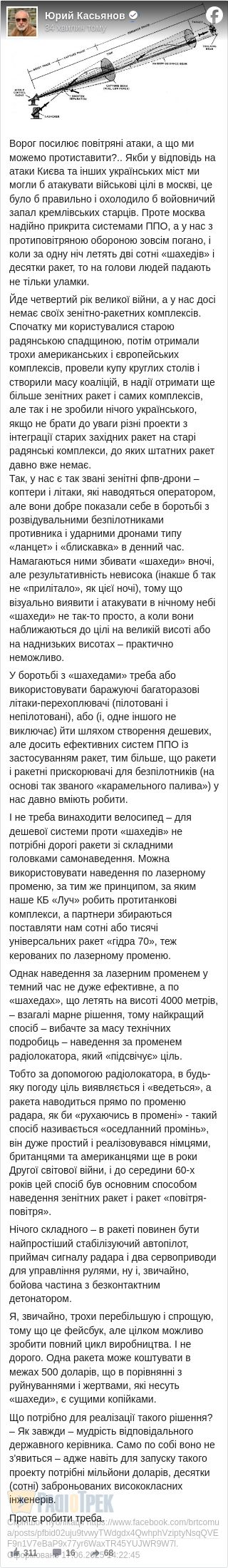 Я, звичайно, трохи перебільшую і спрощую, тому що це фейсбук, але цілком можливо зробити повний цикл виробництва. І не дорого. Одна ракета може коштувати в межах 500 доларів, що в порівнянні з руйнуваннями і жертвами, які несуть «шахеди», є сущими копійками.