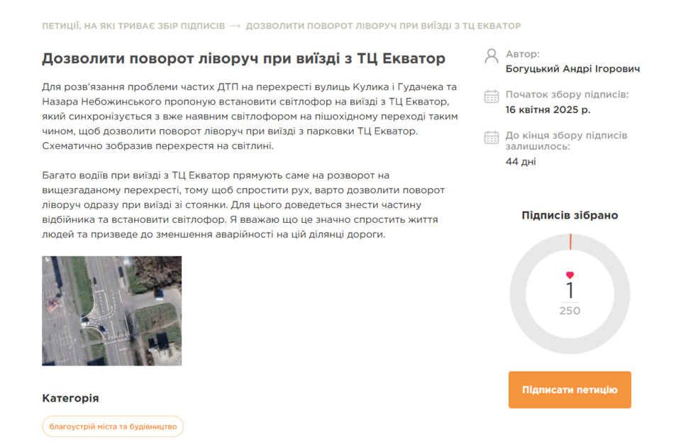 Автор петиції пропонує встановити додатковий світлофор на виїзді з Екватора, синхронізувати його з наявним на пішохідному переході, демонтувати частину відбійника і дозволити виїзд з парковки наліво.