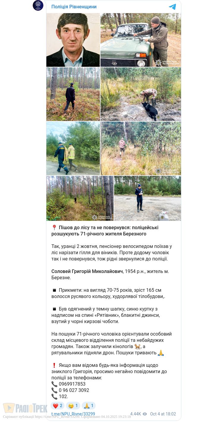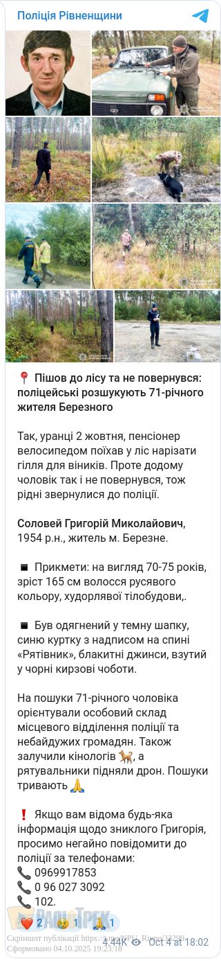 У Березному розшукують 71-річного Григорія Солов’я, який 2 жовтня поїхав велосипедом у ліс і не повернувся додому.