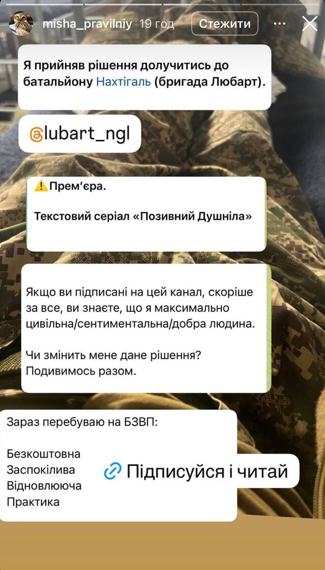 - Я прийняв рішення долучитись до батальйону «Нахтігаль». Зараз перебуваю на БЗВП: безкоштовна, заспокійлива, відновлююча, практична, — поділився артист.