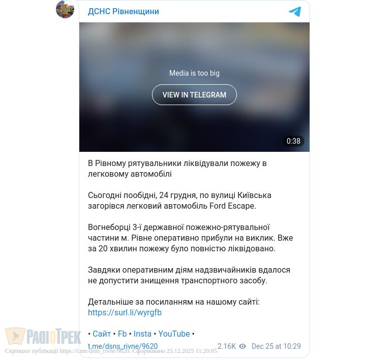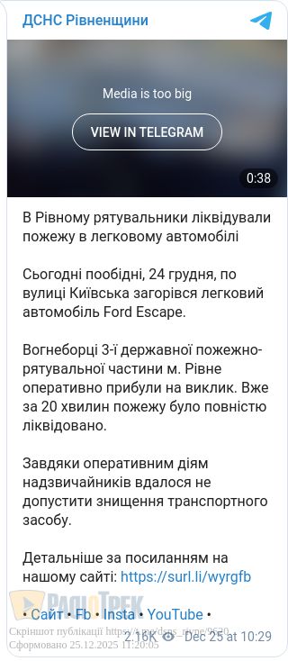 У Рівному рятувальники загасили пожежу в легковому автомобілі. 24 грудня о 13:31 у Рівному на вулиці Київській загорівся автомобіль Ford Escape.