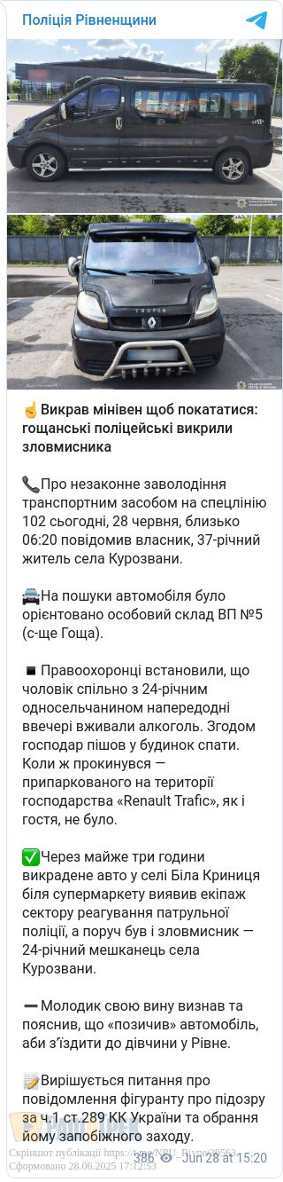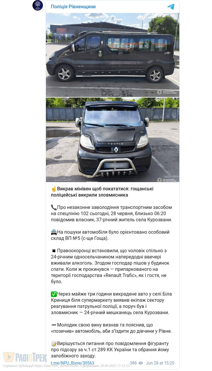 Про крадіжку авто Renault Trafic напередодні заявив до поліції 37-річний житель села Курозвани Рівненського району.