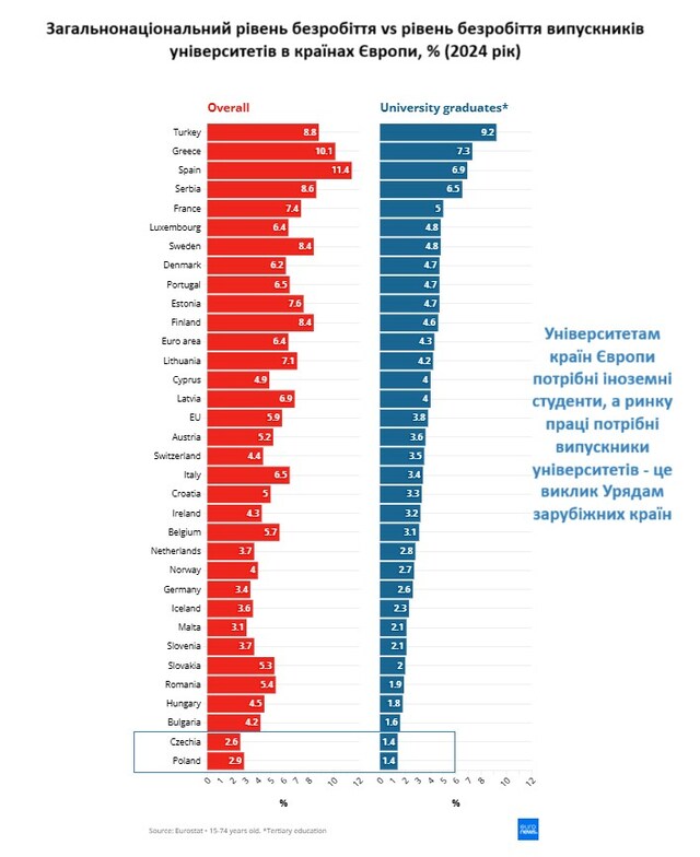 В усіх інших країнах рівень безробіття випускників університетів нижчий загального рівня безробіття в економіці. Для університетів країн Європи та їх абітурієнтів це добра новина.